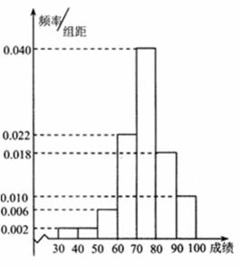 19.为了调查某校学生体质健康达标情况,现采用随机抽样的方法从该校抽取了m名学生进行体育测试.根据体育测试得到了这m名学生各项平均成绩(满分100分),按照以下区间分为七组:[30,40), [40, 50), [50, 60), [60, 70),[70,80),[80,90),[90,100),并得到频率分布直方图(如图),已知测试平均成绩在区间[30,60)有20人.