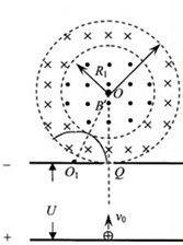 (2)粒子刚好在不进入中间圆形磁场的轨道如图所示,设此时粒子在磁场中运动的旋转半径为r1,在三角形QOO1中由几何关系有: