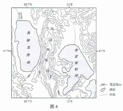 奥赫里德湖和普雷斯帕湖位于巴尔干半岛,是沿断层形成的典型构造湖,由岩性为石灰岩的加利契察山相隔(图4)。奧赫里德湖面积348km2,湖面海拔695m,平均深度144.8m,湖水透明度21.5m,是欧洲透明度最高的湖泊,渔产不甚丰富;普雷斯帕湖面积275km2,湖面海拔853m,平均深度18.7m,湖水透明度1.5~7.2m,透明度湖心最大、近岸较小,渔产颇丰。据此完成9~10题。