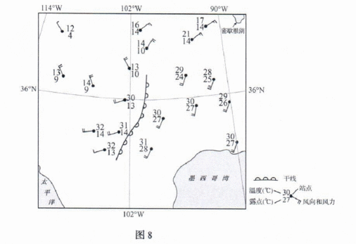 露点是空气因冷却而达到饱和时的温度,其数值越大,反映空气中水汽含量越大。一般情况下,温度相同时湿空气要比干空气密度小。两个温度相近的干、湿气团相遇所形成的锋,称为干线。图8为北美洲部分地区某时刻主要气象要素分布形势示意图,来自极地、太平洋和墨西哥湾的三种性质不同的气团,在落基山以东平原地区交绥形成三个锋:冷锋、暖锋和干线。