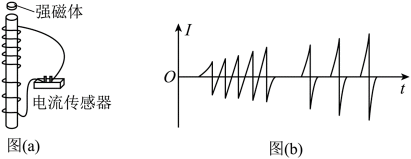 一有机玻璃管竖直放在水平地面上,管上有漆包线绕成的线圈,线圈的两端与电流传感器相连,线圈在玻璃管上部的5匝均匀分布,下部的3匝也均匀分布,下部相邻两匝间的距离大于上部相邻两匝间的距离。如图(a)所示。现让一个很小的强磁体在玻璃管内沿轴线从上端口由静止下落,电流传感器测得线圈中电流I随时间t的变化如图(b)所示。则( )