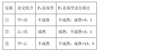 乙烯是植物果实成熟所需的激素,阻断乙烯的合成可使果实不能正常成熟,这一特点可以用于解决果实不耐储存的问题,以达到增加经济效益的目的。现有某种植物的3个纯合子(甲、乙、丙),其中甲和乙表现为果实不能正常成熟(不成熟),丙表现为果实能正常成熟(成熟),用这3个纯合子进行杂交实验,F1自交得F2,结果见下表。