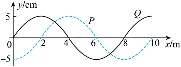 (2)分别沿x轴正向和负向传播的两列简谐横波P、Q的振动方向相同,振幅均为125px,波长均为8m,波速均为4m/s。t=0时刻,P波刚好传播到坐标原点,该处的质点将自平衡位置向下振动;Q波刚好传到x=10m处,该处的质点将自平衡位置向上振动。经过一段时间后,两列波相遇。