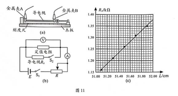 如图11(a)所示,导电绳的一端固定,另一端作为拉伸端,两端分别用带有金属夹A、B的导线接入如图11(b)所示的电路中。