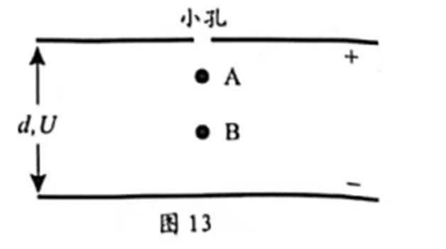 密立根通过观测油滴的运动规律证明了电荷的量子性,因此获得了1923年的诺贝尔奖。图13是密立根油滴实验的原理示意图,两个水平放置、相距为d的足够大金属极板,上极板中央有一小孔。通过小孔喷入一些小油滴,由于碰撞或摩擦,部分油滴带上了电荷。有两个质量均为
