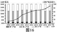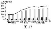 材料二 黄石市2008年被定为资源枯竭转型试点城市,2015年年底关闭第一批露天矿山,采掘业产值明显下降。图16为“2008~2017年黄石市GDP和三次产业结构统计图”,图17为“2008~2017年黄石市轻重工业产值统计图”。