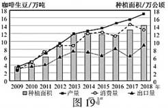材料二 咖啡种植已成为我国云南部分地区支柱产业、出口创汇产业和农村扶贫产业,2014年被农业部列入重点支持发展的特色产业。目前我国咖啡生豆产量位列全球第13位,但人均咖啡消费水平低,产业利润丰厚的加工、流通环节多为外国品牌控制。图19为“我国咖啡种植面积和生豆产量、出口量、消费量统计图”。