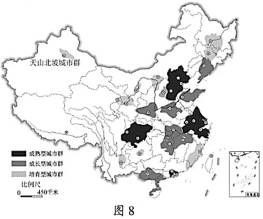 城市群在参与国际竞争与合作,支撑全国经济增长,推进区域协调发展等方面具有重要作用。目前我国已建设19个国家级城市群。图8为“我国城市群空间分布示意图”。读图回答15~16题。