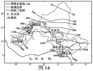 材料二 图14为“尼日尔河流域及降水分布示意图”,表1为“尼日尔河部分水文站年径流量与年输沙量统计表”。