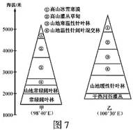 图7为“甲、乙两山地同纬度的山地垂直带谱示意图”。读图回答13~14题。
