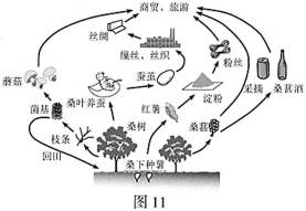 随着工业化、城市化推进,桑蚕产业由长江中下游和珠三角地区逐渐西移。2005年以来,广西蚕茧产量稳居全国首位,桑蚕业助推35个石漠化贫困县脱贫致富。图11为“广西桑蚕业平怀模式示意图”。据此回答21~22题。