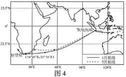 选择大洋航线时,应在确保航行安全的前提下,充分考虑气象、海况条件和岛礁等因素,尽可能沿地球表面大圆(以地心为圆心过地表两点的圆)航行。图4为“巽他海峡西行好望角的大洋航线示意图”。据此回答7~8题。