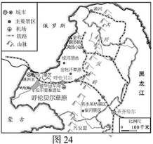 32.[旅游地理]呼伦贝尔大草原是世界四大草原之一。呼伦贝尔市拥有5A级景区1家、4A级景区16家、国家级非物质文化遗产17项,及呼伦湖世界生物圈保护区。图23为“呼伦贝尔草原景观图”,图24为“呼伦贝尔主要旅游资源分布示意图”。回答下列问题。(10分)