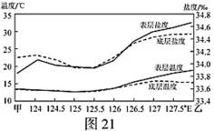 [海洋地理]图20为“我国东部部分海域等深线分布图”,图21为“沿30°N海域甲~乙的冬季表、底层海水多年平均温度和盐度空间分布图”。回答下列问题。(10分)