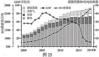 33.[环境保护]图25为“2000~2018年我国GDP、能源消费、SO2排放量统计图”。回答下列问题。(10分)