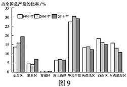 我国粮食产量自2004年以来连续16年增长,有效保障了国家粮食安全。图9为“我国不同区域三个年份粮食产量占比图”。读图回答17~18题。
