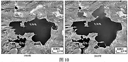 研究人员在调查青藏高原地理环境时,利用遥感技术获得了20世纪80年代以来青藏高原上一千多个湖泊面积的年际变化数据。图10为“青藏高原色林错地区1984年和2015年同期卫星影像图”。据此回答19~20题。