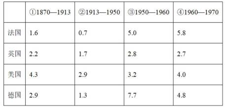 (1)根据材料“主要资本主义国家国民生产总值年均增长率”可知,法国:1913年前较快增长;20世纪前半期增速明显下降;1950—1970年,高速增长;英国:总体上平稳缓慢增长:20世纪前半期增速有所下降;1950—1970年,恢复增长;美国:1913年前高速增长;20世纪前半期增速明显下降,但在主要资本主义国家中仍保持优势;1950—1970年,恢复高速增长;德国:1913年前较快增长;20世纪前半期增速下降;1950—1960年,高速增长;1960—1970年,增速有所放缓。