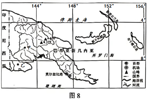 材料二:图8示意巴布亚新几内亚主要岛屿。