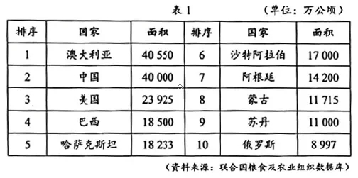 读表1“世界永久性草地和牧场面积前十位的国家”(2000年)。据此完成19~20题。