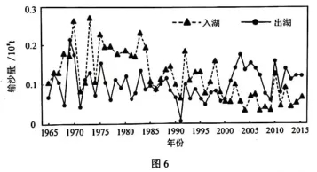 图6示意鄱阳湖入湖和出湖年输沙量的年际变化。2003年三峡工程运营后,鄱阳湖水量、泥沙等水情变化明显,对湖区供水、灌溉、航运等造成重大影响。据此完成15~16题。