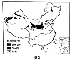 图2示意某种沉积物的分布。该沉积物在小兴安岭等山地的西侧宽度较大,而东侧少见。