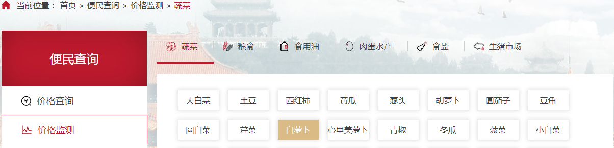 17.在北京市发展与改革委员会官方网站,可以看到“价格查询“和“价格监测“栏目,点击“价格监测”,出现如下信息: