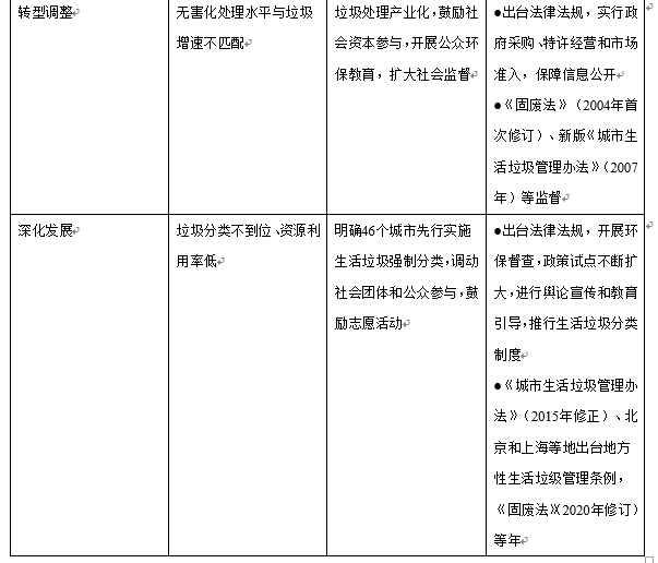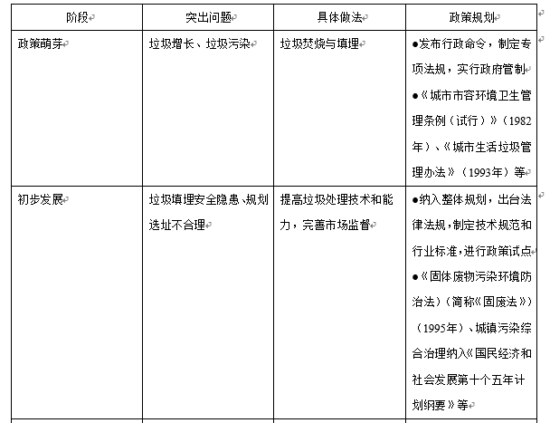 ②政策初步发展阶段开始将处理垃圾的政策纳入国民经济整体发展规划,通过出台法律法规,制定技术规范和行业标准,进行政策试点。反映出政府已经能够顺应市场经济发展的需要,通过提高垃圾处理技术和能力,通过行政命令和法律手段完善市场监督。