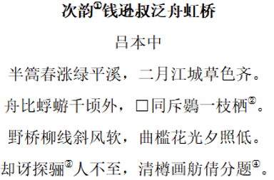 第一小题:斥鷃于《庄子·逍遥游》,用来与鹏做对比,而诗中诗人先是说自己的小舟如同蜉蝣版渺小,之后是“同斥鷃一枝栖”,意思是和斥鷃这样一只渺小的小鸟在同一枝条上落脚,鹏代表的意向是巨大的,宏伟的,诗人这里想要表达的不应是对比,而是想要表达自己同斥鷃一样,因此推测空缺处可能是表达诗人自身的字。