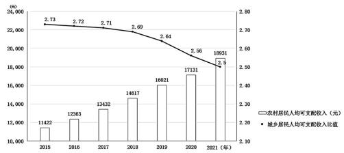 图2反映2015-2021年我国农村居民人均可支配收入变化情况、城乡居民人均可支配收入比值变化情况。