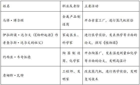 材料二 18世纪,英国地方性科学社团兴起,在应用科学和技术领域具有广泛影响。在伯明翰,一些科学家、实业家和工程师组织了一个名为“月光社”的社团,定期在成员家中集会并开展研究。下表为月光社部分成员的相关信息。