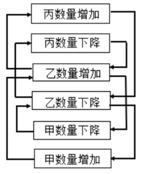 分析题图可知,甲数量增加导致乙数量增加,而乙数量增加导致丙数量增加、甲数量下降;乙数量下降导致丙数量下降、甲数量增加,可见甲、乙、丙三者的能量流动方向是甲→乙→丙。
