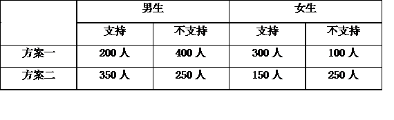 某校为举办甲、乙两项不同活动,分别设计了相应的活动方案:方案一、方案二。为了解该校学生对活动方案是否支持,对学生进行简单随机抽样,获得数据如下表: