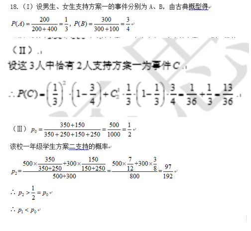 (Ⅱ)从该校全体男生中随机抽取2人,全体女生中随机抽取1人,估计这3人中恰有2人支持方案一的概率;