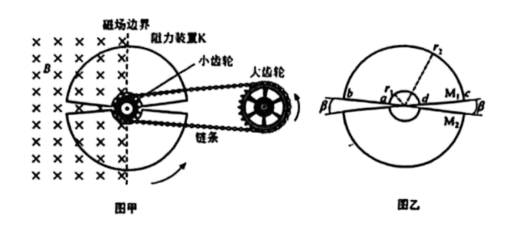 某兴趣小组为研究非摩擦形式的阻力设计了如图甲的模型。模型由大齿轮、小齿轮、链条、阻力装置K及绝缘圆盘等组成。K由固定在绝缘圆盘上两个完全相同的环状扇形线圈