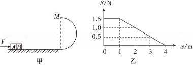 如图甲,水平地面上有A、B两个物块,两物块质量均为0.2kg,A与地面动摩擦因数为μ=0.25,B与地面无摩擦,两物块用弹簧置于外力F的作用下向右前进,F与位移x的图如图乙所示,P为圆弧最低点,M为最高点,水平地面长度大于4m.