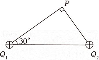 两个点电荷Q1与Q2静立于竖直平面上,于P点放置一检验电荷恰好处于静止状态,PQ1与Q1Q2夹角为30°,PQ1⊥PQ2,则Q1与Q2电量之比为 ,在PQ1连线上是否存在其他点能让同一检验电荷维持平衡状态 (存在,不存在)。