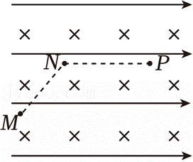 空间中存在垂直纸面向里的匀强磁场B与水平向右的匀强电场E,一带电体在复合场中恰能沿着MN做匀速直线运动,MN与水平方向呈45°,NP水平向右。带电量为q,速度为v,质量为m,当粒子到N时,撤去磁场,一段时间后粒子经过P点,则( )