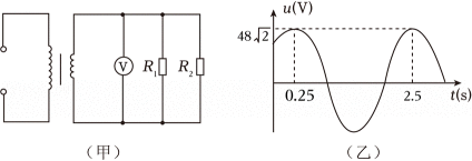某理想变压器如图甲,原副线圈匝数比4:1,输入电压随时间的变化图像如图乙,R1的阻值为R2的2倍,则( )
