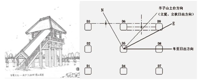 距今约3000年前的金沙道址(3041N,10401E)是古蜀国时期的一处大型聚落遗址。在演遗址祀区的东部,有一处九柱建筑基址,其9个柱洞呈“田”字形分布。研究发现,这些柱润分布具有一定的天文属性。图7为九柱建筑的复原示意图;图8示意该建筑柱洞平面分布及当时冬至日的日出方位,据此完成15-16题。