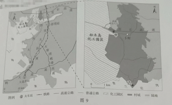 (3)为解决职工的职住分离问题,该园区拟在S村的甲、乙两地建设职工生活区。分析这两地居住环境的优劣。(6分)