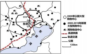 (1)指出2000年前后东京都市圈大型购物中心分布的变化特点。(6分)
