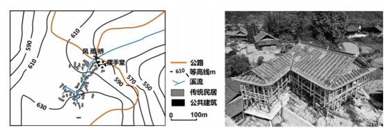 湖南省永顺县双凤村是一个典型的土家族村寨,地处武陵山区腹地,村寨中一条小溪蜿蜒流淌,潺潺水声伴随着弯弯青石板路和依山而建的土家转角吊脚楼,勾勒出一幅土家山寨的美丽画卷,被誉为中国“土家第一村”。左图示意双凤村地建筑分布,右图示意在建的转角吊脚楼。据此完成下面小题。