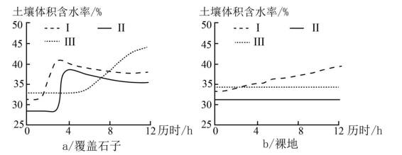 第二小题解析:从图b中可以看出,I曲线变化明显,降雨后土壤含水量上升明显,说明其为测量深度30厘米的土壤体积含水率,曲线Ⅱ和Ⅲ为测量60厘米和100厘米的土壤体积含水率,Ⅱ和Ⅲ在降雨后没有明显变化,说明裸地下渗量小,地下径流少,地表产流多,对土壤深处的土壤含水率影响不大,B正确,CD错误;图b中曲线I、Ⅱ和Ⅲ是同时进行人工降雨实验,降水量一致,A错误。故选B。